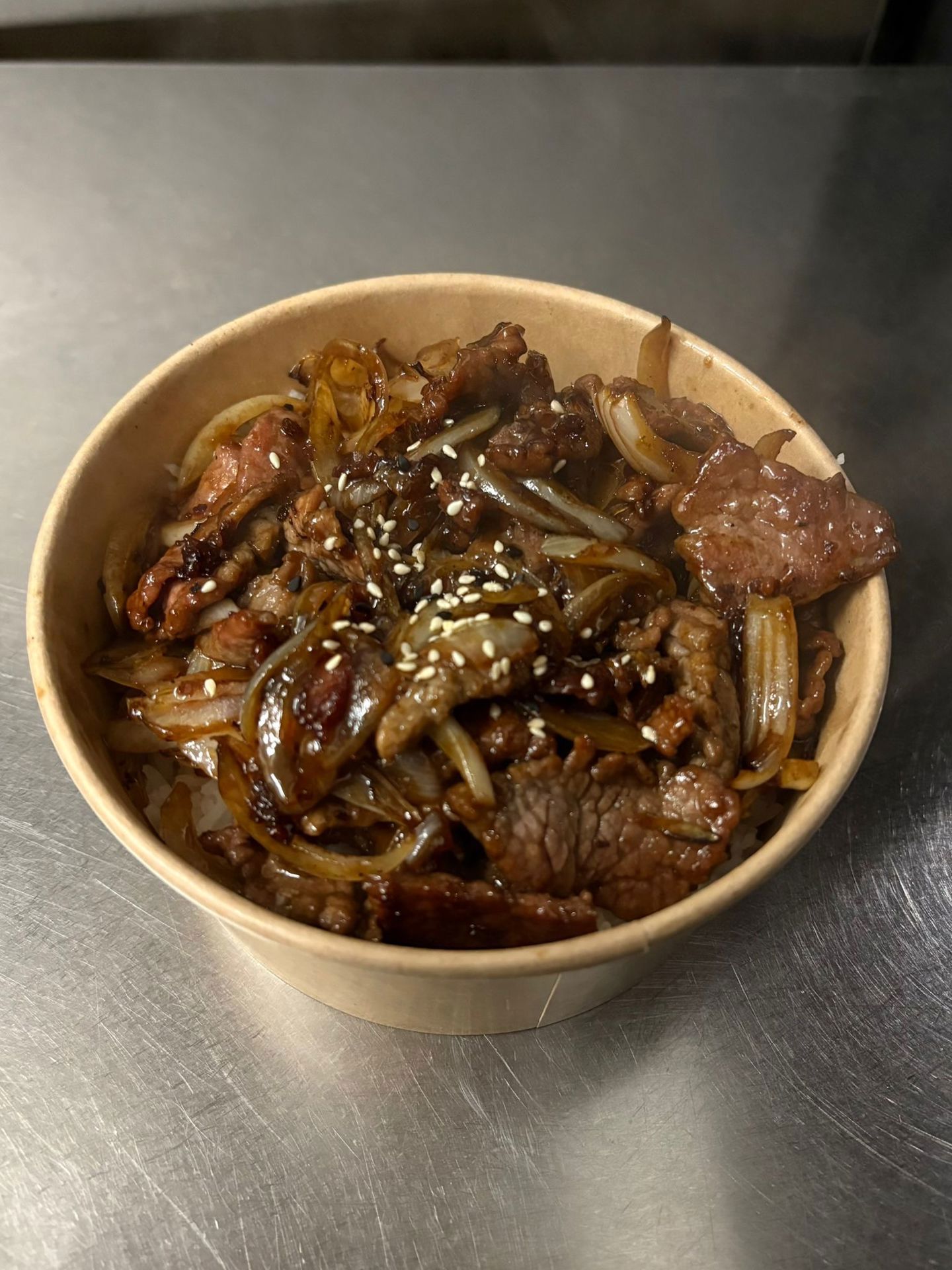 Lamelles de bœuf sauté aux oignons sur un bol de riz chaud