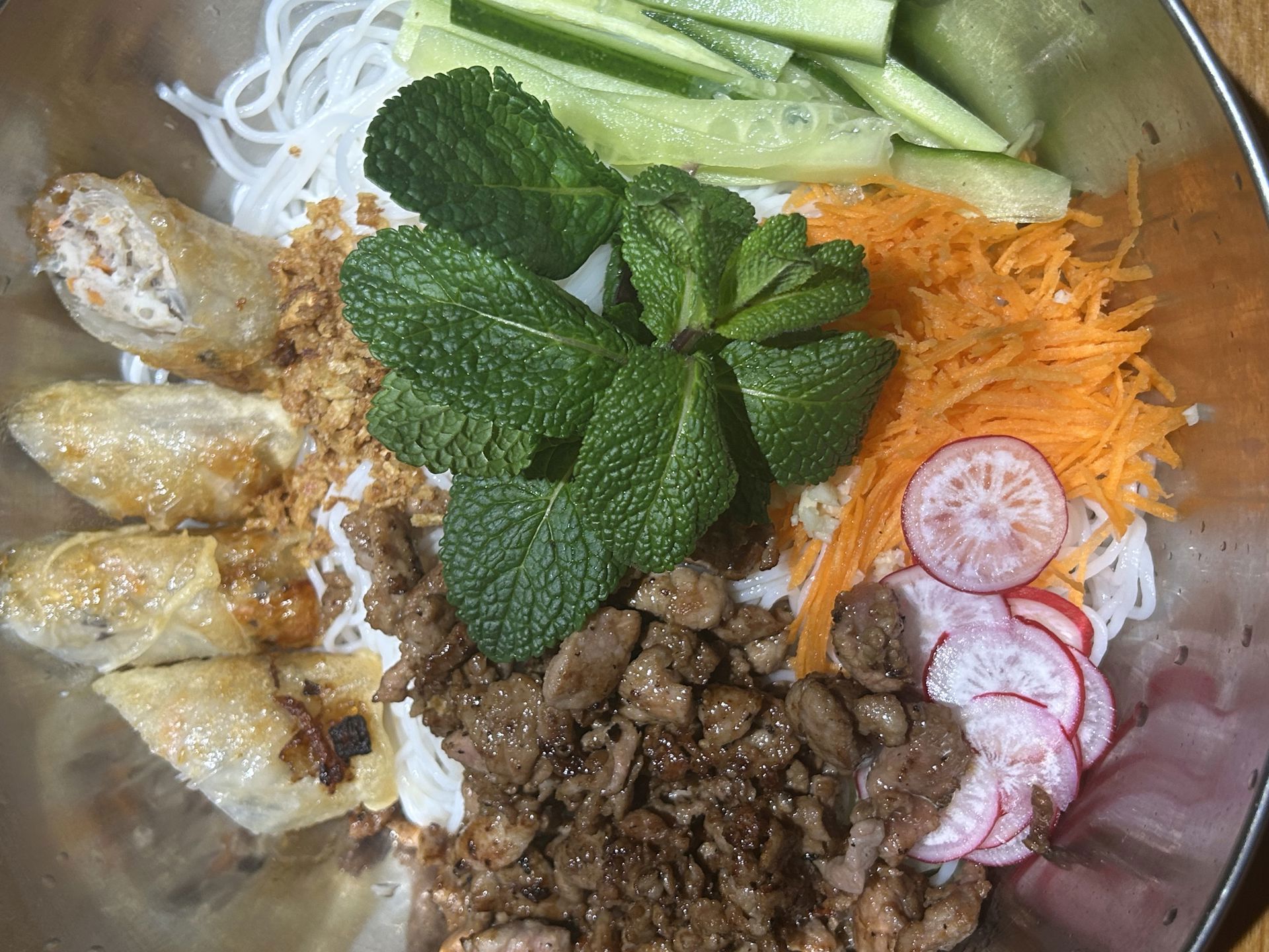 vermicelles de riz • carotte râpée • concombre • batavias • Menthe fraîche • Oignons frits Et nem aux poulets. cacahuètes 🥜 !!