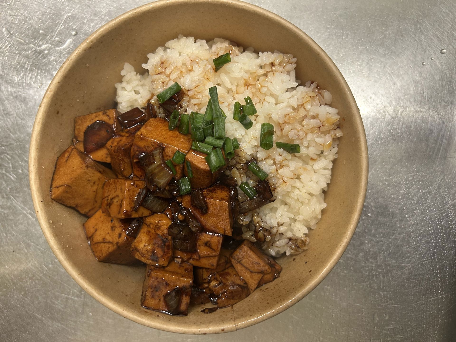 Toufu teriyaki avec des riz 🍚 . 100% végétarien. Salade et riz